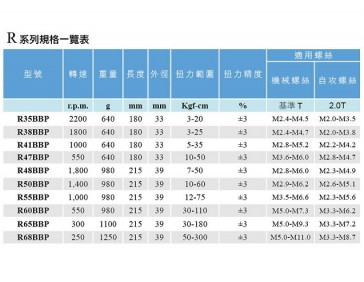 能力 | 扭力範圍: R35BBP:3-20 Kgf-cm R38BBP:3-25 Kgf-cm R41BBP:5-35 Kgf-cm R47BBP:10-50Kgf-cm R48BBP:7-50 Kgf-cm R50BBP:10-60Kgf-cm R55BBP:12-75Kgf-cm R60BBP:30-110Kgf-cm R65BBP:30-180Kgf-cm R68BBP:50-300Kgf-cm |